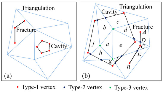 The intersection of the triangulation and the geometries of the fractures and cavities. (a) The fracture or cavity in the interior of a triangle; (b) the fracture or cavity covers multiple triangles.