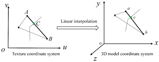 The reconstructed graph’s vertices may be classified into three groups (Figure 6). By using different methods to convert the vertices to 3D space, the seamless overlapping rendering of these vector graphics on the outcrop surface can be realized. Type-I vertices are vertices existing before reconstruction. We use the projection method introduced in Section 3.3 to solve its 3D model coordinates. The vertex of triangulation of the DOM is known as Type-II vertices, and its 3D model coordinates are known as well. Type-III vertices are newly generated points in the process of superposition and intersection, and their 3D model coordinates can be calculated by linear interpolation. It is assumed that there is a type-III vertex C in the texture space, which is positioned on an edge AB, as illustrated in Figure 7. The corresponding edge of AB edge in 3D space is ab, and the 3D coordinates of the two ends of edge ab are a (x1, y1, z1) and b (x2, y2, z2), respectively. If the transformation from edge AB to edge ab is regarded as a linear transformation, the coordinates of the corresponding point c (x0, y0, z0) of point C in the 3D coordinate system can be solved by Formula (9).