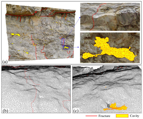 The feature detection algorithm of fractures and cavities has been discussed in detail in the literature [24,27], and its efficiency and effect are worthy of affirmation. Therefore, in Windows 10 environment, this paper carries out experiments through the algorithm in Section 3.3, Section 3.4 and Section 3.5. Using C++ programming language and 3D visualization open source library (OSG), the author realizes the related algorithms and 3D visualization of fractures and cavities graphics. Figure 8 is a test effect figure of the implemented algorithm on a test model. In Figure 8a, the 3D graphics of fractures and cavities are accurately fitted on the test model surface. Figure 8b shows the rendering effect of vector lines (fractures lines) on the DOM, and the fractures lines are closely attached to the triangular surface. There are no abnormalities of aliasing, suspension, and penetration. Figure 8c shows the rendering effect of vector surface (cavities) on the framework model. The edge of the face is precisely cut in this figure, and the interior of the face suits the model perfectly.