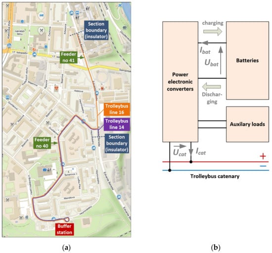 The buffer station was planted next to end stop “Sídliště Bory” of trolleybus lines numbers 14 and 16 (see Figure 1a). The trolleybus power section, to which the buffer station was connected, covers 1.8 km of line 16 and 1.2 km of line 14. During normal operation, the power section is supplied from substation MR7-Bory with two sets of feeders connected to different points of catenary. The feeders’ numbers are 40 and 41. Optionally, feeder no. 41 may be supplied from more remote substation MR1-Hydro through an auxiliary bus.