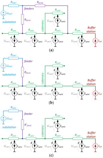 The values of circuit parameters are listed in Table 1. The substation is modelled as a voltage source and a series resistance. The latter reflects voltage drops due to power conversion in the substation itself as well as drops in AC power system that supplies the substation. The parameters of substation model were obtained by linear approximation of output voltage in function of output current, which was derived from long-term recordings. The feeders are represented by resistances computed based on their length, cross section and conductor material. The catenary is modelled in similar manner, but the resistances have sliding terminals (like potentiometers) whose setting is related to location of the supplied trolleybus. The trolleybuses are modelled as variable current sources, as well as the buffer station. The number of vehicles and their locations are illustrative, as they change during operation. Based on the equivalent circuits, the range of the voltage drops may be approximated. For example, assuming a single trolleybus located near the BS and drawing current Iveh4 = 300 A from the catenary [2], the voltage drop on the modelled resistances is: 166 V for the case shown in Figure 2a, 264 V for Figure 2b, and 316 V for Figure 2c. As typically several vehicles run along the considered supply section, the voltage drops cumulate by the rule of superposition. Hence, the real voltage drops may be much higher than those given above.