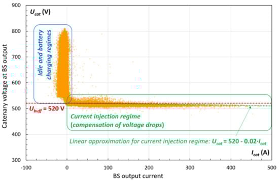 The basics of BS operation are depicted in Figure 3, based on recordings of BS output current Icat and voltage Ucat, throughout a selected workday. The recordings are affected by the measurement noise, but the following relations can be noticed. If the output voltage is greater than the preset buffering voltage Ubuff, the current Icat has a relatively small negative value related to charging batteries and supplying auxiliary loads. If the output voltage drops below Ubuff, the BS injects current (positive Icat) to the trolleybus catenary. According to the linear approximation shown in the chart, the ratio between the value of injected current and the voltage drop below Ubuff is at a level of 50 A/1 V. Such a limited ratio causes that the voltage may further drop below the set Ubuff. However, such a smooth increase in injected current is necessary to ensure stability of the supply system.