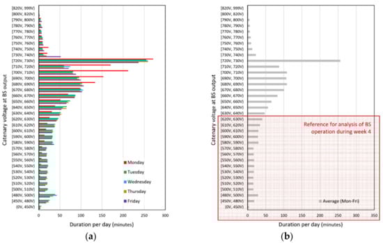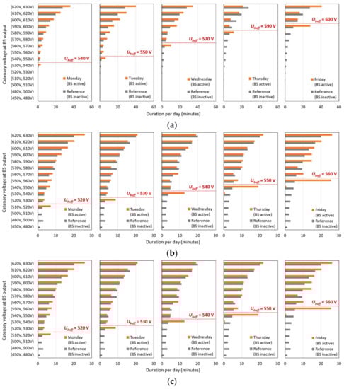 The daily histograms for weeks 1, 3 and 5 (inactive BS) were averaged, individually for each week, in order to obtain reference histograms corresponding to particular operating conditions and inactive buffer station. The exemplary results of averaging histograms for week 3 are shown in Figure 4b. Such a reference allows for analysis of the effectiveness of voltage drops compensation by comparing voltage histograms for days when BS was active with the reference histogram that corresponds the same supply conditions, but lack of BS’s influence. As active BS impacts the histograms only when its output voltages are lower than Ubuff, and this parameter was set between 500 and 600 V during the tests, the comparison of histograms was limited to voltages lower than 630 V, as marked in Figure 4b. The results of the comparisons are shown graphically in Figure 5. The Ubuff setting for each day is marked in the corresponding graphs. According to the principle of BS control, discussed in Section 2, the Ubuff setting corresponds to the voltage that triggers the current injection, not the lowest expected catenary voltage. Therefore, the long bars in Figure 5 that represent voltages slightly below the Ubuff setting do not indicate any improper operation. Generally, in the case of active BS and operating conditions that would cause excessive voltage drops, the voltage values cumulate in a range between Ubuff—10 V and Ubuff. The content of lower bars in the graphs is insignificant, with an exception related to Friday, week 6. However, during this day additional tests were performed aiming at verifying a protection against deep discharging of batteries, implemented into the control algorithm. For this reason, the process of batteries charging was disturbed in the control system. Hence, during a part of this day, the BS was not able to inject sufficient current to the catenary since its control priority was changed to maintaining a minimal level of batteries charge.