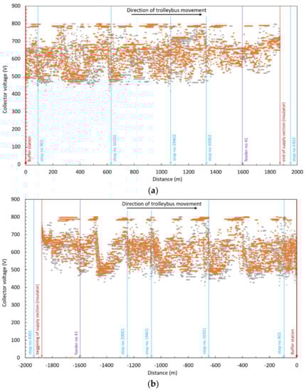 Trolleybus pantograph voltage in function of distance from BS for inactive BS (gray) an active BS (orange) recorder by 10 northbound trolleybuses (a) and 10 southbound trolleybuses (b).