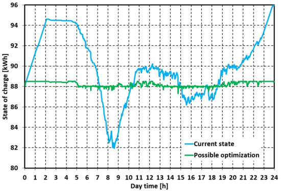 In the existing buffer station system, the battery is charged several times a day with large doses of energy (Figure 7, blue line). It is possible to consider another method of charging: more often charging, but with small amounts of energy. Charging can take place according to the voltage criterion, that is, the battery will be charged if the voltage in the overhead contact line will have a sufficiently high level. An exemplary effect of such a change in the battery control is presented in Figure 7 (green line). Higher charging frequency reduces the degree of discharge of the battery. Thanks to this, it would be possible to reduce the required capacity of the BS battery.