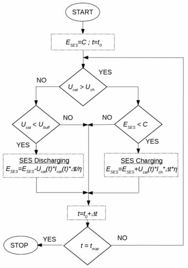 The scheme of r calculation algorithm: C—the capacity of BS battery, ESES—actual energy accumulated in BS battery, Ucat(t), Icat(t)—actual catenary voltage and BS load current (from registration), tmax—duration of the registration, η—efficiency.