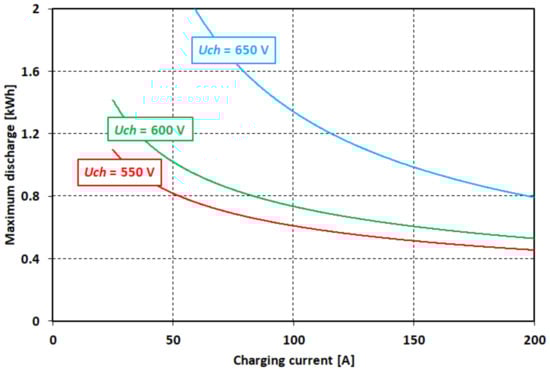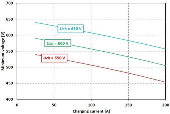 Figure 9 shows the relationship between the required BS capacity and Ichar current. The calculations were made for three levels of catenary voltage above which charging is activated: 550 V, 600 V and 650 V. By reducing the voltage level for charging activation and increasing the charging current, the capacity of the BS battery can be reduced. However, increase of the charging current increases the load of the overhead contact line, which may not be recommended in the case of a weak overhead contact line (i.e., high resistance of supply network). This phenomenon is presented in Figure 10, where the level of the minimum voltage in the overhead contact line during charging of BS stations is presented. Increasing the battery charging current causes an increase in the traction network load, and thus an additional voltage drop. If we want to use the full power of the battery converter, the charging current can be 200 A. Assuming that the overhead line voltage should not drop below 550 V during charging, the maximum charging current can only be used at a trigger voltage of 650 V. In the case of a trigger voltage of 600 V the charging current of the battery should be limited to 100 A. Nevertheless, it should be noted that in both cases the same capacity of the battery will be required, of 0.8 kWh.