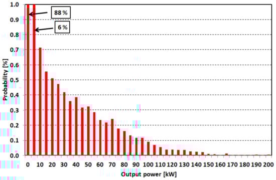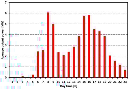Figure 11 shows the average values of the BS output current and Figure 12 shows the histogram of instantaneous values. It should be noted that the BS load is short-term, that is, the instantaneous load values can reach 200 kW, but on an hourly scale it does not exceed 10 kW.
