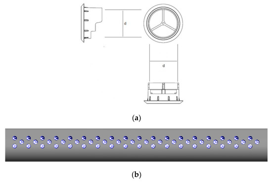 In the present study, the supply device was a circular duct (0.25 m diameter and 2 m long) mounted 0.05 m below the ceiling level which had 57 nozzles on each side (d = 0.028 m) placed in three rows with 19 nozzles each. The configuration of each side can be seen in Figure 1, the spacing between columns was 3 jet diameters and the spacing between the top and bottom rows was 1 jet diameter, see [33] for more details, shown in Figure 1 and Figure 2. Supply device nozzles can be fitted with caps that block the nozzles.