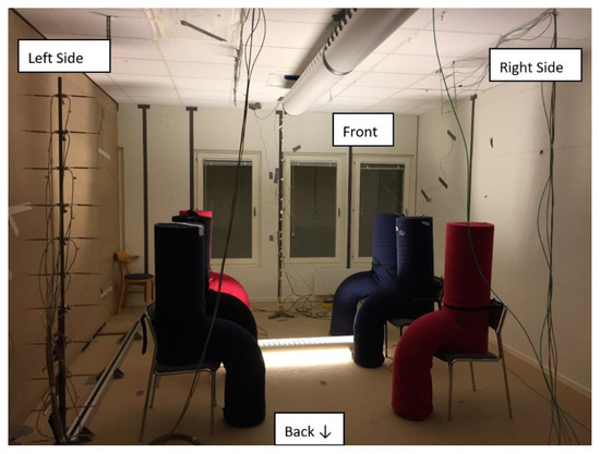The study was performed in a climate chamber (7.2 × 4.2 × 2.7 m3) at the University of Gävle in Sweden, representing a typical conference room environment. The climate chamber is versatile and has previously been used to investigate different indoor environments, e.g., open-plan offices [17,41], classrooms [33,34,35,47], and small offices [15,48].