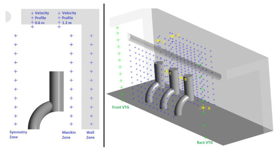Placement of the measurement points in the CFD model (right side of the room). + CTA, + Thermocouples and + Tracer gas.