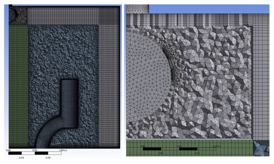 The commercial finite volume solver Fluent 19.5 (Ansys 2019) was used to numerically solve the governing equations. The installed memory was 128 GB and 24 × 2.50 GHz processors (Intel Xeon E5–2680 v3) were used. The SIMPLE algorithm was used to control the pressure–velocity coupling. The gradient was solved with the least squares cell-based method. The pressure term used the PRESTO! scheme and an under-relaxation factor of 0.5. The momentum term used a third order-scheme (3rd MUSCLE) and an under-relaxation factor of 0.5. Both terms for the turbulent kinetic energy and the specific dissipation rate used a third-order scheme (3rd MUSCLE) and both used an under-relaxation factor of 0.8. The parameters for the DO Radiation model were set to 10 energy iterations per radiation iteration, 2 Theta Divisions, 3 Phi Divisions, 1 Theta Pixels, and 3 Phi Pixels. The solution was considered converged if the residual was less than 10−3 for the continuity and less than 10−4 for u, v, w, k, ε, f and . At least 20,000 iterations were used for each case.3.5. Mesh Strategy