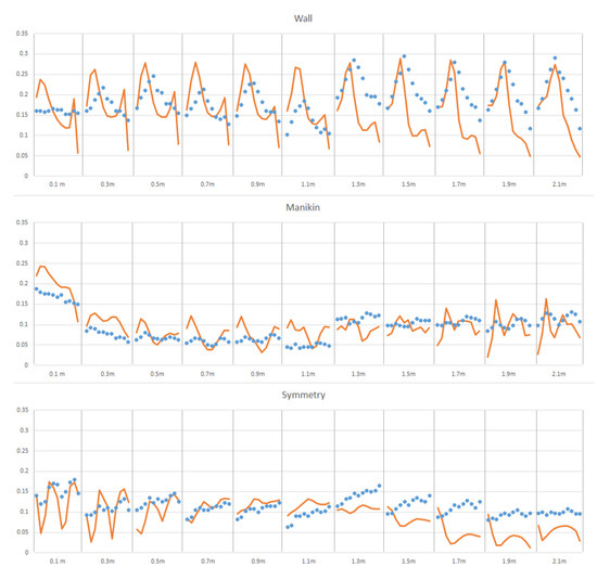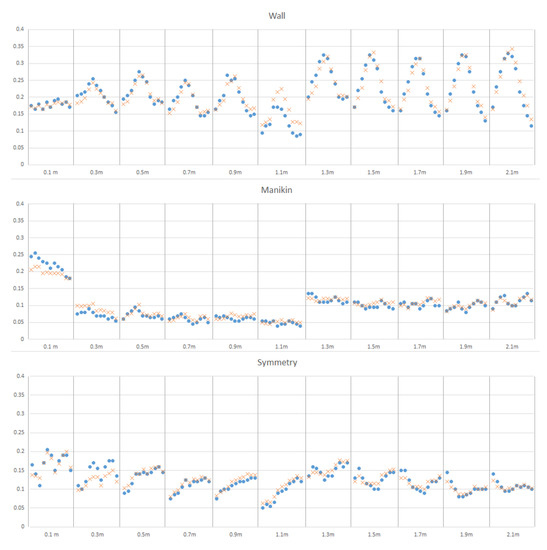 CTA probes were used to measure the air speed, root mean square (RMS) of the velocity and temperature. Eight probes were used to measure two velocity profiles in the ceiling in front of the middle of the supply device, one velocity profile was located 0.6 m from the center of the supply device (called velocity profile 0.6 m) and one velocity profile was located 1.2 m from the center of the supply device (called velocity profile 1.2 m). Twenty-two probes were placed in eleven pairs with a distance of 0.45 m at eleven different heights (0.1, 0.3, 0.5, 0.7. 0.9, 1.1, 1.3, 1.5, 1.7, 1.9 and 2.1 m) and traversed over a distance of 2.5 m (stopping at 11 locations) to measure the wall, manikin, and symmetry zone on both sides of the room, see Figure 3. At each location, the traverser stopped, and 2 × 15 min measurements were carried out. After the measurements, the traversing system was moved to measure a new series of 2 × 11 × 11 measurement points for a total of three series. This gave a total number of 734 (11 × 11 × 2 × 3 + 4 × 2) measurement points for the CTA probes. The CTA probes were calibrated for the velocity range 0.05 and 1.00 m/s and had an air speed accuracy of ±0.05 m/s anda temperature sensor accuracy of ±0.2 °C. The CTA probes had a response time of 0.2 s to 90% of a step change and the sampling interval was 60 s. The air speed was averaged over the 2 × 15 min measurements for each point.