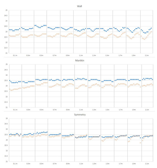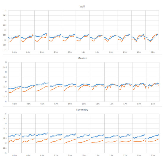 Figure 6 shows the temperature measurement for Case 4, which had the largest difference in temperature difference between left and right side. All cases had slightly higher temperatures on the right side of the room. The pattern of the temperature curves was the opposite of the velocity profiles with the lowest temperature in the middle of the horizontal stretch in the wall zone. Higher temperatures were in the front of symmetry zone and lower temperatures were in the back of the symmetry zone, compare Figure 4 and Figure 5. The amplitude of the pattern was somewhat higher on the left side of the room in Case 4, see Figure 5. It is worth noting that the difference in velocities between the heights of 1.1 m and 1.3 m did not significantly affect the VTG in any of the zones. The velocities increased above 1.1 m, but the VTG remained relatively flat above 0.7 m in all three zones on both sides of the room, see Figure 5. See the explanation in Section 4.3.2.