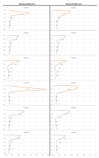 Velocities (x-axis, [m/s]) of the ― CFD and ● CTA (× = measurement range CTA) for all cases at different heights (y-axis, [m]). Left: Velocity profile 0.6 m Right: Velocity profile 1.2 m.