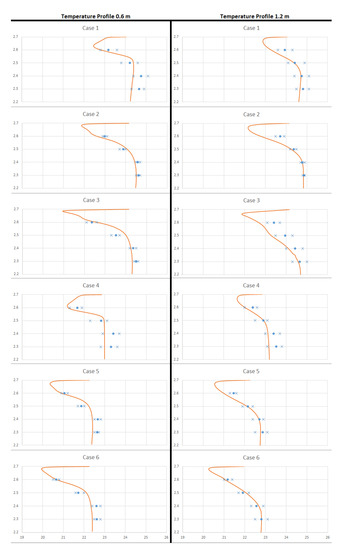 The numerical model was validated via a statistical analysis by comparing each case against the measured results. Since there was a slight difference in the temperature profiles of the two sides of the room, an average (over the two sides) of both the velocity and temperature measurement was used for the validation of the numerical model. In the cases where there was an oscillation in the results (Cases 2 and 3), average values from the CFD results over one cycle (4000 iterations) were used for the statistical analysis (the case with the best statistical match is presented in the figures). The error between the measured and predicted result was calculated according to: