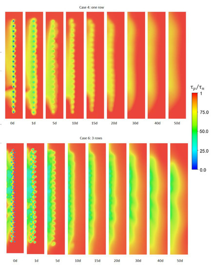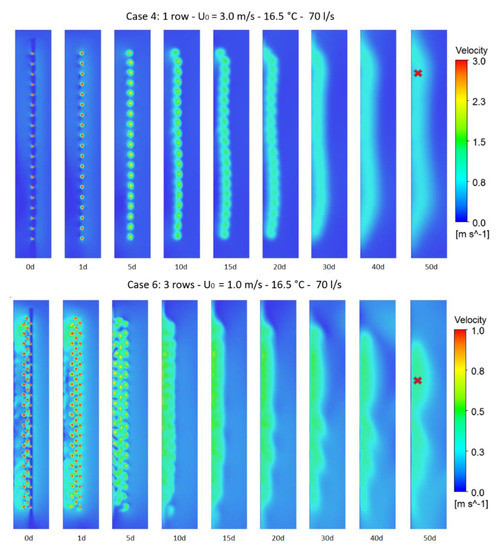 Confluent jets (CJ) can be defined as multiple interacting jets issuing from different nozzles [3]. Numerous studies have been completed on the near-field development of confluent jets both experimentally [21,22,23,24,25] and numerically [26,27,28,29]. Generally, the near-field development of CJ is divided into initial, converging merging, and combined regions. After a certain distance downstream from the nozzles, the combined jets behave as a single jet, where the individual jets can no longer be identified; this region is called the confluent core zone. In an array of free-moving jets where the number of columns is the same as the number of rows, the length of the regions downstream can be estimated based on the jet diameter (d) [23,24,26,28]. In the initial region (0d to 2d) the jets show no sign of interaction with each other or any decrease in velocity. In the converging region (2d to 4d) the jets bend towards the central line of the array and the jets at the edges bend faster than those close to the center. In the merging region (4d to ~9d–14d) the jets start to merge, which happens faster for the edge jets and later for the central jets. In the combined region (~9d–14d to ~20d) the minimum velocity of the combined flow field is no less than 90% of the maximum velocity. In the confluent core zone (~20d to ~11 × d × n, where n is the number of rows) the jets have combined to a single jet with uniform streamwise velocity and low turbulence in the central line of the array. The two parameters that have the highest influence on the near-field development are the jet diameter (d) and the spacing between the jets (S). The combined factor (S/d) has the highest influence on the jet development. An increase in (S/d) increases the length of the converging and merging regions. A higher (S/d) also prolongs the confluent core zone but lowers its velocity and turbulence. The factor (S/d) does not however affect the entrainment rate of the combined jet. CJ on a curved surface behaves similarly, but will produce a slightly more oblong jet instead of a uniform one [27,30].