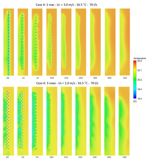 Six experimental cases were investigated, see Table 1. The cases were named after supply temperature, airflow rate, and number of rows. Three cases had TS = 17.5 °C and an airflow rate of 50 L/s. Each of these cases had one, two, or three rows of nozzles open on each side of the supply device, while three cases had TS = 16.5 °C and 70 L/s. The airflow rate and number of nozzle rows affected the jet inlet velocity (U0) for each supply device and case, see Table 1. The two airflow rates were chosen together with the number of nozzles to give a wide span of inlet velocities. The airflow rate 50 L/s conformed to Category (III) in the EN 16798–1:2019 standard (low polluting building, LPB-2) and the airflow rate 70 L/s conformed to Category (II) in the EN 16798–1:2019 standard (low polluting building, LPB-2) [50]. The Nozzle configuration for the 3 rows can be seen in Figure 1, for the 2-row cases the top row was blocked, for the 1-row cases the two top rows were blocked.