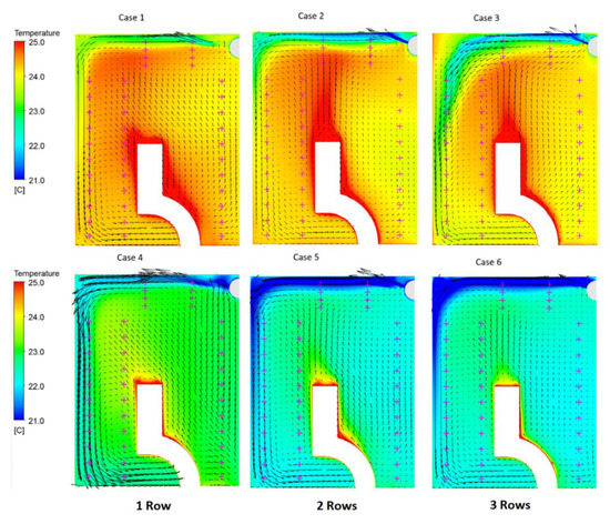 Each case was set up with airflow rate, supply temperature, and number of open rows. The measurement was running for at least 16 h to ensure quasi-steady state conditions. The temperature data were collected and analyzed to make sure that steady-state conditions had been reached. The CTA probes were then traversed in three series to measure the air speed and temperature. Afterwards, the CTA measurements were taken.