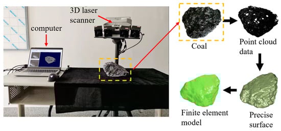 In this paper, a 3D laser scanner and finite element method are used to reconstruct the real shape of coal. The processing process is shown in Figure 1. First, a 3D laser scanner is used to obtain the surface point cloud data of coal blocks. The point cloud data are then processed into precise surfaces in Geomagic Studio software. Finally, the model is divided into tetrahedral elements in HyperMesh to obtain the finite element model.