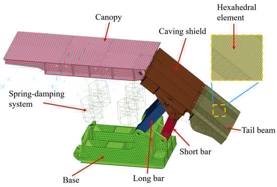 In this paper, a ZF4800-17-32 top caving hydraulic support is used as the research object, its working resistance is 4800 KN, the maximum and minimum working height are 3.2 m and 1.7 m respectively. The finite element model of the hydraulic support is shown in Figure 2; the telescopic beam and insert plate and other structures were omitted in the process of modeling because they have little influence on the vibration response of the hydraulic support. Caving shield and tail beam are parallel, and the Angle with the ground is 40°. The hydraulic support model is meshed in HyperMesh. The main research objective of this paper is the vibration response of caving shield and tail beam, so these two parts are divided into hexahedral elements with higher accuracy [23]. Other structures use tetrahedral elements, and the total number of elements is 233,472. The rotation pair in the hydraulic support is realized by creating a virtual rotation pair, and the hydraulic cylinder is assumed to be a spring damping system [15].