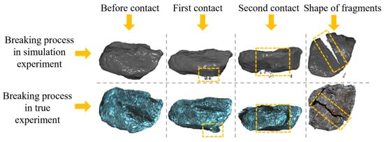 The coal block breaking process is mainly divided into the first and second contact. After the first contact, the position where the coal block hits the steel plate is broken, the impact expands the defects and fissures inside the coal block, but does not cause the whole fracture, then the coal block rotates in the air and the second contact occurs, the fissure is further expanded and connected and the coal block breaks into two large pieces. The crushing effect presented by the two tests is similar, so the test proves that the numerical simulation of the coal material model can simulate the real coal breaking process.