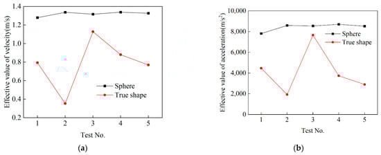 Extracting the velocity and acceleration signals within the impact area of the steel plate and calculating the effective value, Figure 5 shows the changes in the velocity and acceleration of the five tests in which the steel plate was hit by two shapes of coal blocks and found that when the spherical coal block hit the steel plate, the changes in acceleration and velocity were negligible. However, when the real shape coal block hits the metal plate, the acceleration and velocity response are not only less intense than the spherical coal block but also there are obvious irregular changes. The reason is that the connection between the centroid of the spherical coal block and the position of contact is the same as the direction of speed, which can make the coal block transmit more energy to the metal plate, and because the true shape is extremely irregular, the position of the centroid of the coal block has been changing with the change of the fall angle, and the local shape of the area where the coal block comes into contact with the steel plate is also changing. Thus, the ideal shape used in the current study has great limitations, and it is not possible to simulate the process of contact between coal gangue particles and hydraulic support close to the real situation.