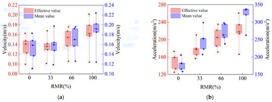 (a) Box chart of velocity response in different RMR. (b) Box chart of acceleration response in different RMR.