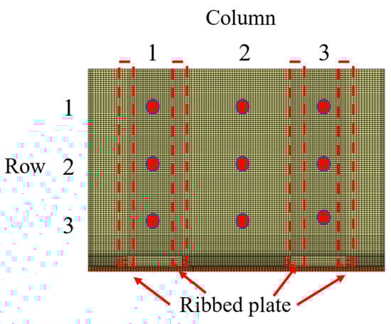 To study the difference in vibration response of the tail beam caused by coal gangue particles with different RMR, a series of calculation cases as shown in Figure 6 are designed, in which the RMR is 0%, 33%, 66%, and 100%, respectively. The nine rock masses had the same mass, and the rock mass rushed to the tail beam perpendicular to the base at a speed of 8 m s−1. Five tests were conducted for each RMR by changing the angle of the rock mass.