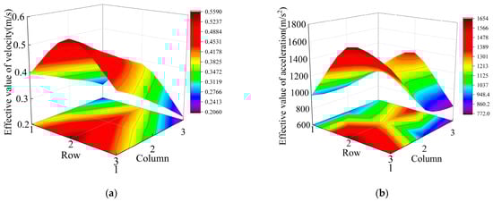 Five groups of tests with RMR of 0% were selected, and nine points were selected on the tail beam. The distribution of points is shown in Figure 8. The mean values of the effective values of the velocity and acceleration signals of each point in the five tests were counted. The results are shown in Figure 9, the vibration signals with large vibration amplitude are prone to appear at the positions of the first row and the second column. Because the first row is located at the end of the tail beam, far from the hinge point above the tail beam and the hydraulic cylinder in the middle, it will produce a larger deflection after impact. The second column is located near the centerline of the tail beam, far from the ribbed plate on both sides, which will greatly limit the free vibration of the tail beam. The results provide a reference for the arrangement of sensors on the tail beam.