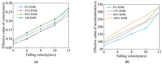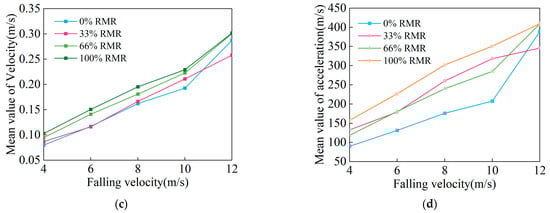 (a) Falling velocity versus effective value of velocity under different RMR. (b) Falling velocity versus effective value of acceleration under different RMR. (c) Falling velocity versus mean value of velocity under different RMR. (d) Falling velocity versus mean value of acceleration under different RMR.
