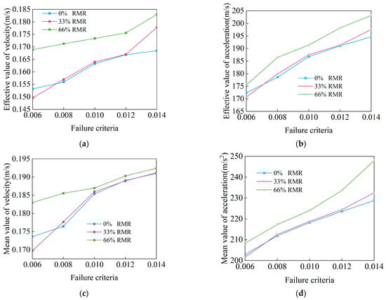 (a) Failure criteria versus effective value of velocity under different RMR. (b) Failure criteria versus effective value of acceleration under different RMR. (c) Failure criteria versus mean value of velocity under different RMR. (d) Failure criteria versus mean value of acceleration under different RMR.