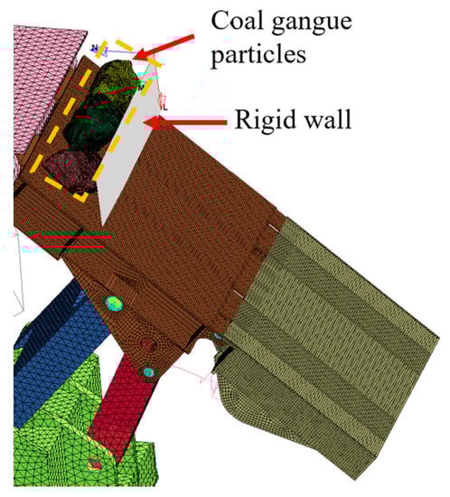To study the response of the hydraulic support when the coal gangue particles are sliding on it, three coal gangue particles are placed above the caving shield in this section. The rigid wall is added to the position in Figure 13. The rigid wall can prevent the coal gangue particles from sliding. Under the action of gravity, the three rock particles are stabilized on the side of the rigid wall. By setting the dead time of the rigid wall, the three rock particles begin to slide from the same height and time. The mass of coal and gangue particles was the same when the RMR was 0%, 33%, 66%, and 100%, respectively.