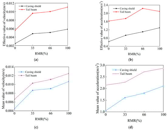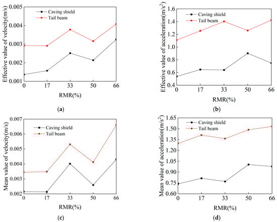 Vibration response of caving shield and tail beam under the impact and roll. (a) RMR versus effective value of velocity. (b) RMR versus effective value of acceleration. (c) RMR versus mean value of velocity. (d) RMR versus mean value of acceleration.