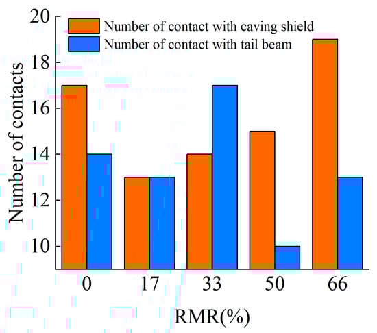 Number of contacts between coal gangue particles with different RMRs and caving shield and tail beam.