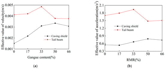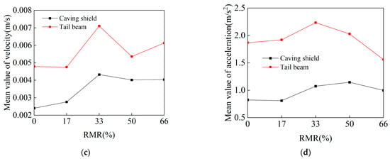 The fluctuation of contact numbers directly affects the vibration signals of the caving shield and tail beam. Figure 17 shows the relationship between the RMR and the vibration response of the caving shield and the tail beam under the initial state of the coal gangue particles with velocity and angular velocity. Compared with the results in Section 3.2.2, the results are more tortuous, and both the characteristics of velocity and acceleration have lost a clear overall trend. The results show that in this case, the coal gangue identification method based on vibration cannot detect the change of RMR.