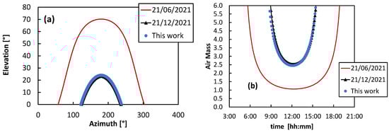 θ, plotted as a function of the azimuth angle in the test site (Siena, Italy). In the figure, the June and December solstice curves enclosed the band of possible values achievable during the year. Note that the tests in this work were carried out near the December solstice, corresponding to the worst insolation scenario. The following analysis of irradiation depends on the air mass value, which is calculated from sun elevation as follows [
