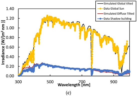 Figure 3c shows the global and diffuse spectra measured in clear sky conditions in the middle of the day compared with those simulated with the SMARTS toolkit for the corresponding AM = 2.5. The plot evidences a good match between the data and simulated curves.