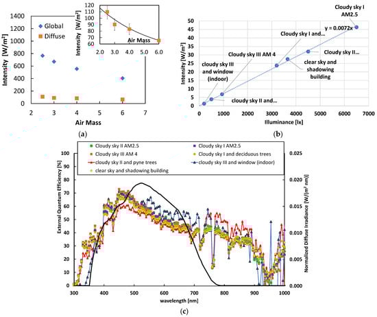 Figure 3c) and trees, as well as shielding of a transparent glass window (in the absence of artificial light). In particular, cloudy sky I and II refer to measurements performed in the same air mass conditions (AM = 2.5, middle of the day) but in the case of slightly different surrounding environments, leading to different diffuse intensities. Cloudy sky III refers to measurements performed at a different time of day (morning), thus characterized by a higher air mass (AM = 4). The intensity data followed a linear trend with illuminance. The illuminance measured in the different configurations was in the 200–6500 lx range, with a corresponding intensity in the 2–50 W/m