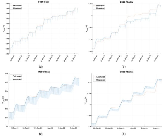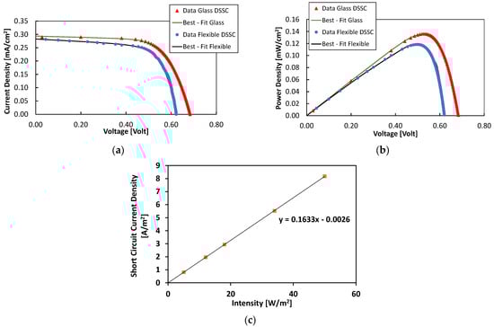 Figure 5a,b shows the I-V and the power–voltage (P-V) characteristics measured with the DSSC glass and flexible modules in the case of diffuse outdoor irradiation with an intensity of 18 W/m
