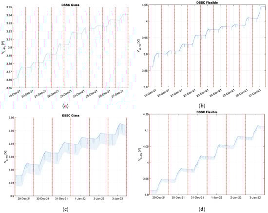 Figure 5c and by considering the area of each PV module. Then, the charge delivered to the battery was obtained by calculating the integral over time of the current net of the consumption of the node. Finally, starting from the computed charge, the corresponding voltage trend was derived by using the linear approximation of a typical charge vs. a voltage characteristic for a Li-Po battery in that particular range as a reference.