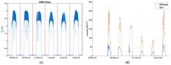 during sunny days (i.e., 19 December 2021, 30 December 2021 and 31 December 2021) compared with those in which the sky was cloudy. In the first case, the operating voltages were smooth, following the sun radiation and not showing the continuous ups and downs due to clouds. The peaks measured in the diffuse intensity of 19 December 2021 and 31 December 2021 were probably due to the fact that at dawn, the cells were hit directly by the sun, as they were oriented toward the northeastern direction.