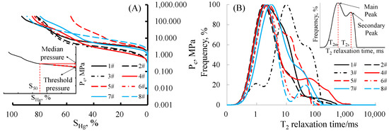 (A) Capillary pressure from high-pressure mercury injection methods; (B) T2 curves from nuclear magnetic resonance tests. T2m—mainstream peak of T2 curves; T2s—secondary peak of T2 curves.