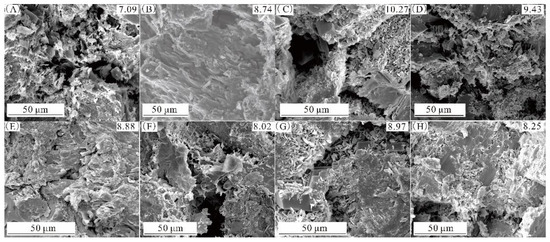 SEM images for sample (A) 1#; (B) 2#; (C) 3#; (D) 4#; (E) 5#; (F) 6#; (G) 7#; (H) 8#.