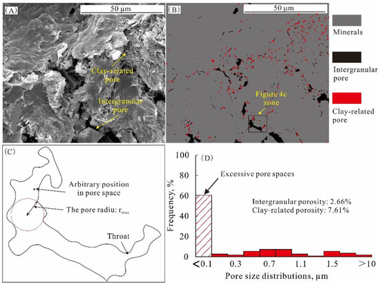 The SEM results show that the sample is relatively dense as a whole, the intergranular pores are almost undeveloped, and the intergranular pores of clay minerals contribute most of the reservoir space (Figure 3). Using software X to perform binary segmentation on the image, the pores can be extracted separately (Figure 4A,B). The extracted pores are measured, and 0.2 μm is the pore radius size interval. While solving the porosity, the pore distribution is output to provide a graphical basis for the subsequent verification of correction means (Table 1, Figure 4C).