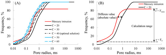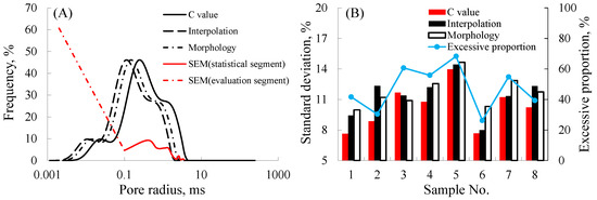 In order to carry out the verification of pore distribution interval, it is necessary to compare the similarity between the fitting curve and the SEM image inversion curve. The specific evaluation method is the standard deviation distribution frequency method; that is, in the comparison image of the non-image curve, the standard deviation of different pore radius differences and the fitting method with the smallest average standard deviation is the optimal solution. Due to the limitation of the resolution of SEM, some micro- and nano-pores cannot be identified. Therefore, for the verification work, this part of the pore space should be ignored (Figure 8A).