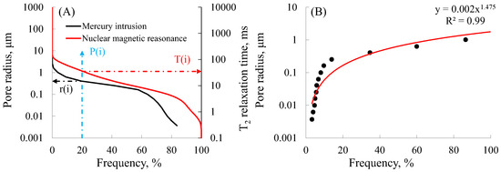 (1) The cumulative T2 relaxation time curve and cumulative capillary pressure curve are drawn on the same X-axis coordinate system. (2) Adjust the range of pore radius to ensure that the slopes of the gentle sections of the two curves are the same. (3) Select a point of T2 cumulative relaxation time in the gentle section to obtain the linear relationship between pore radius and T2 relaxation time, and select at least 10 points to obtain the functional relationship between them (Figure 6). (4) Taking the maximum mercury saturation as the constraint condition, the T2 relaxation time curve is transformed into the pore radius distribution interval curve.