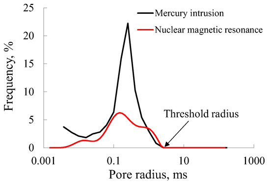 The main principle of the morphological fitting method is the correspondence of main peaks, but this principle has one premise: the number of significant peaks is the same. If the number of significant peaks is inconsistent, it is necessary to translate the T2 relaxation time curve to ensure that the pore radius distribution curve derived based on capillary pressure is less than 0.01 μm. The proportion of pores in M is higher than that in T2 spectrum frequency (Figure 7).