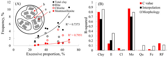 (A) The relationship between clay content and excessive proportion; (B) standard deviation distributions versus different minerals.