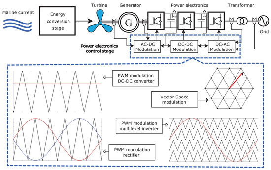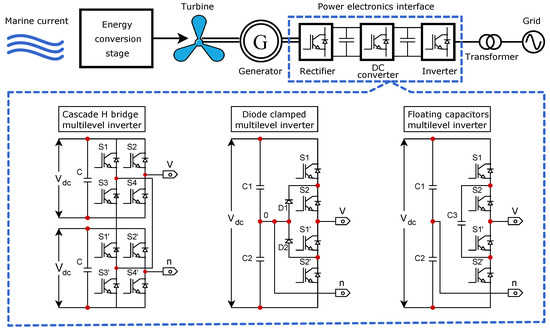 In the evolution of electrical systems, power converters are crucial. The basic layout of a power generation system that harvests ocean flows is depicted in Figure 1, where the inverter architecture relies directly on optimal electrical and operating conditions [10,11,12].